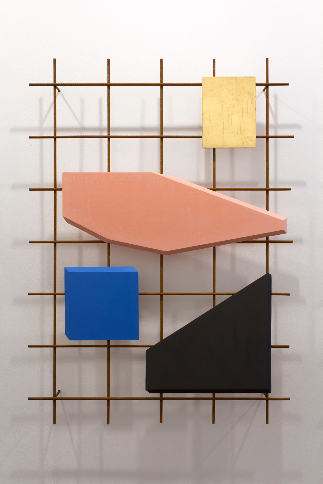 Concrete reinforcing mesh, plywood and MDF, gesso and pigmented gesso, graphite powder bound with rabbit skin glue, gold leaf, rubber floor tiles.