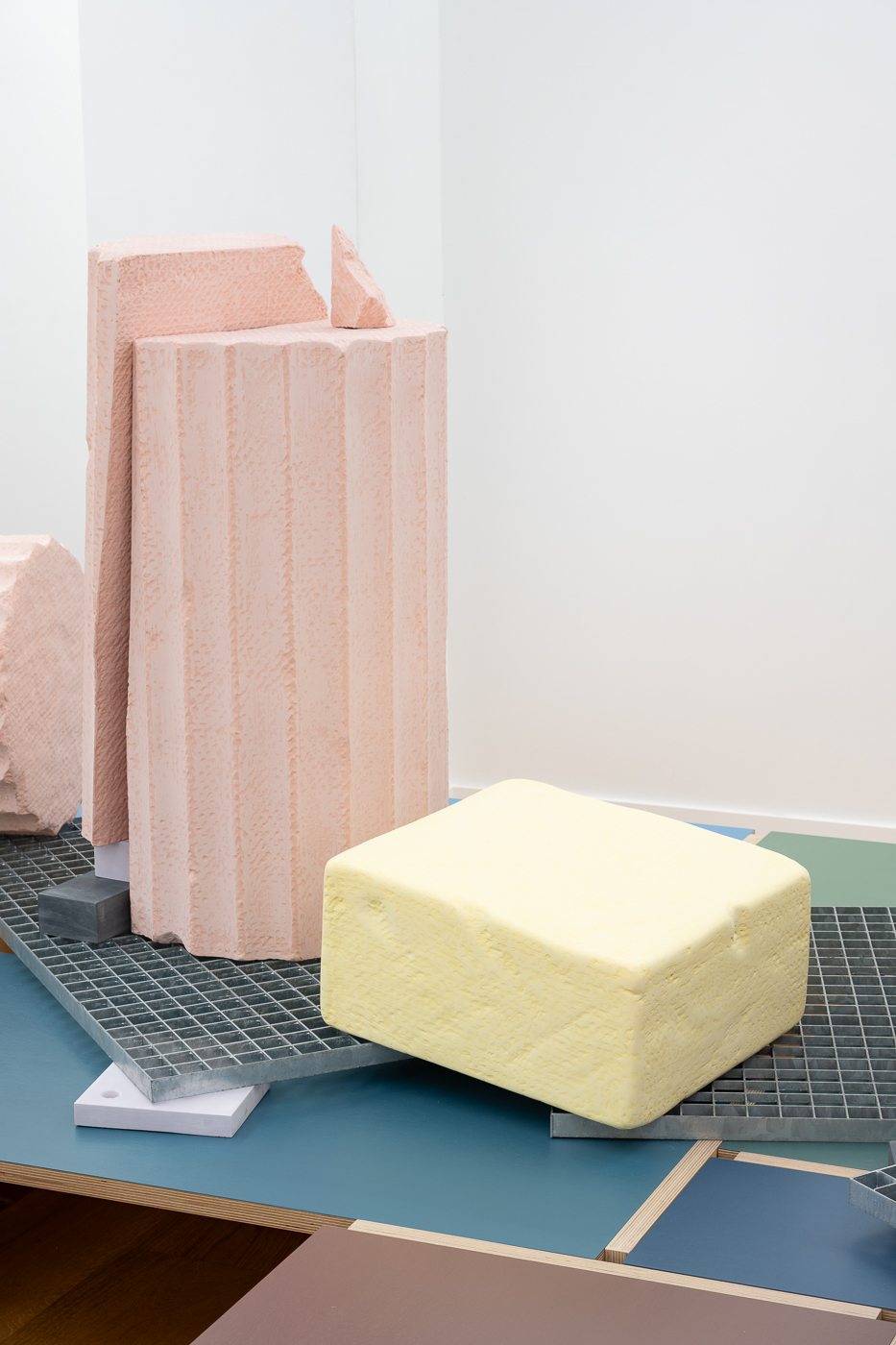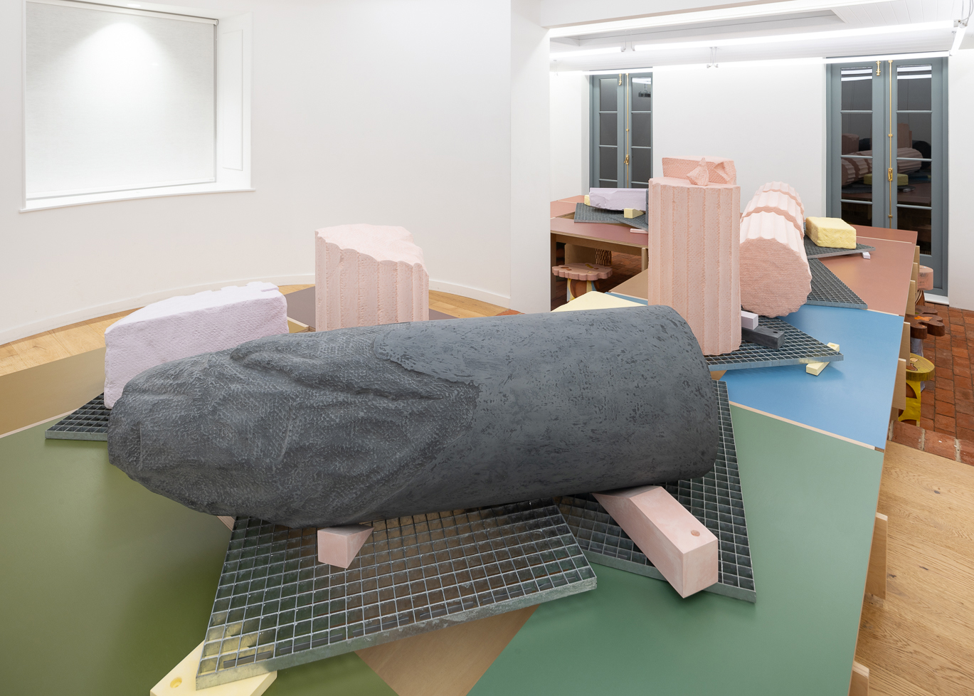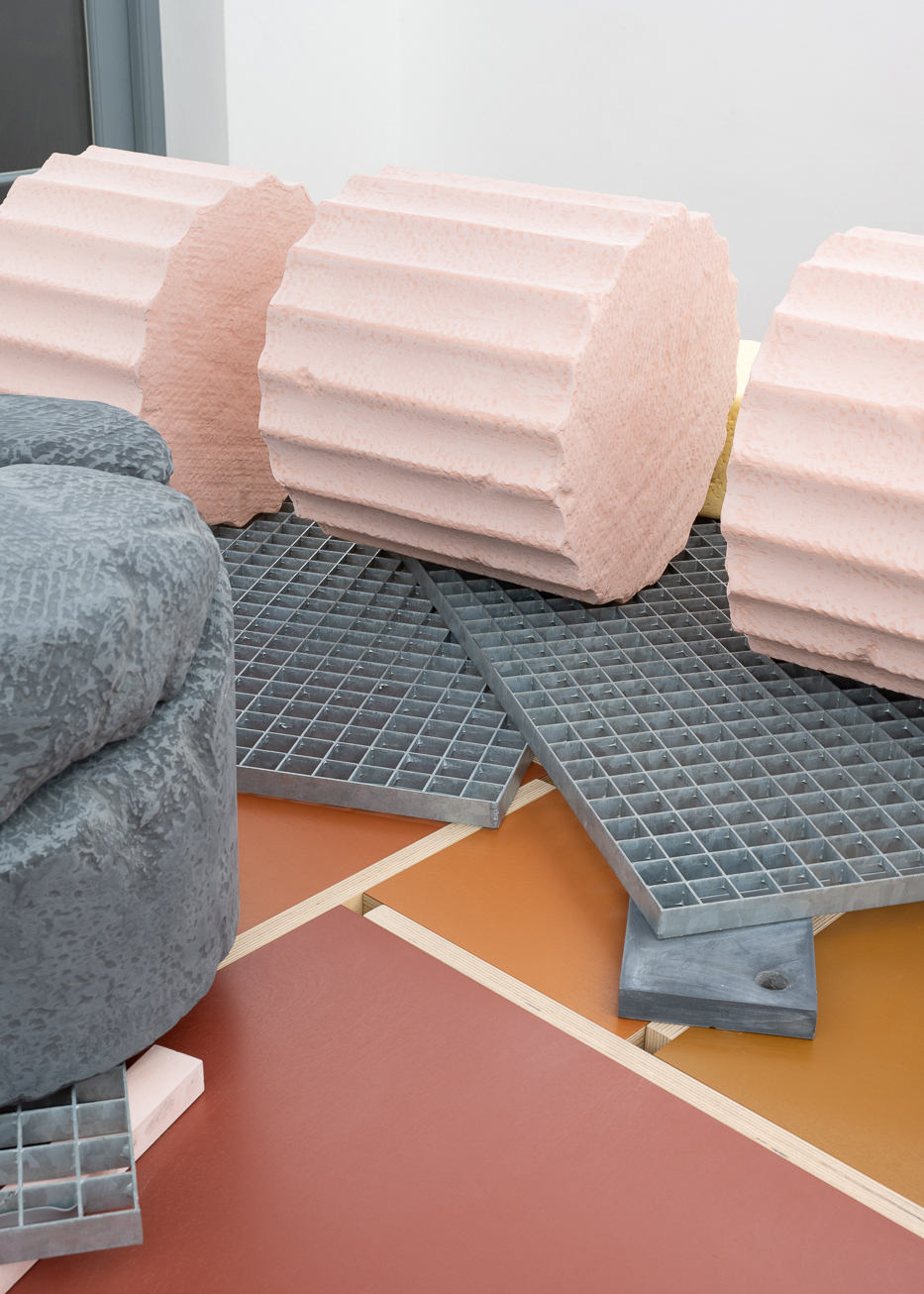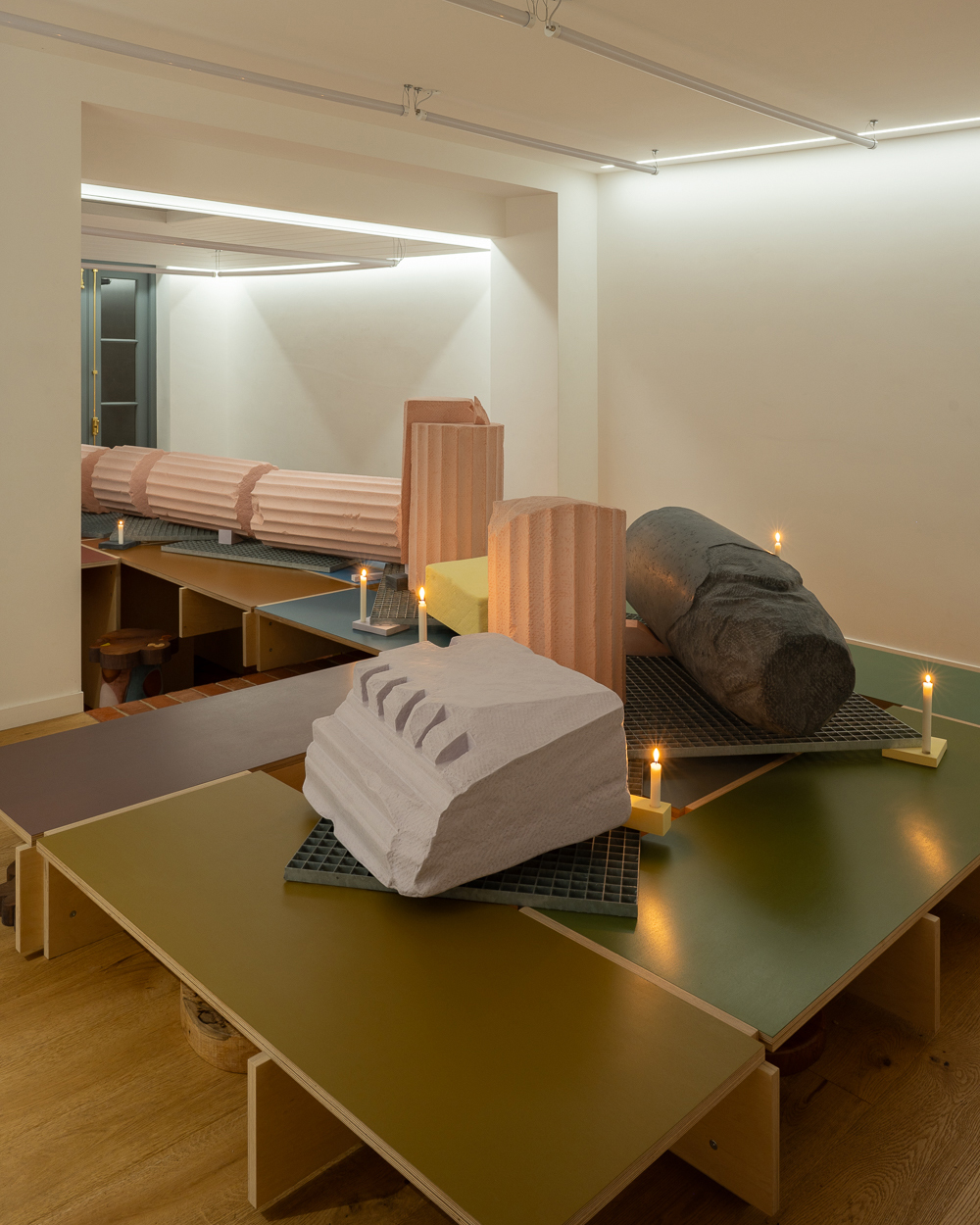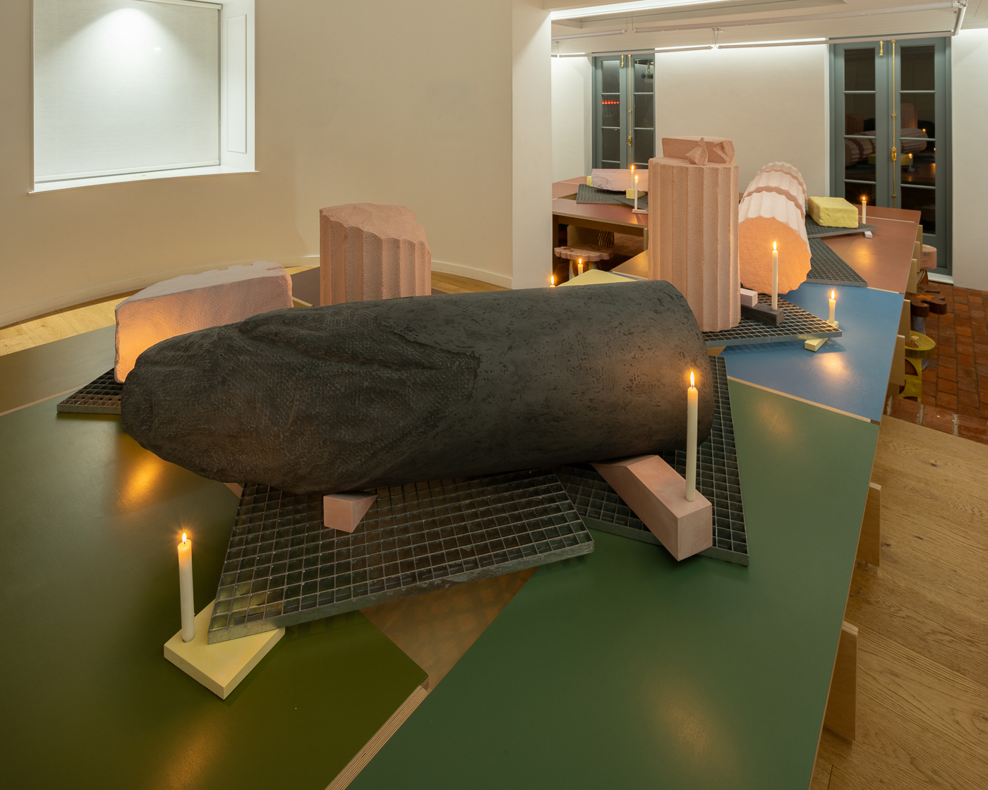 Polystyrene, fibreglass matting, pigmented Jesmonite, galvanised steel elefant grates, wax candles.