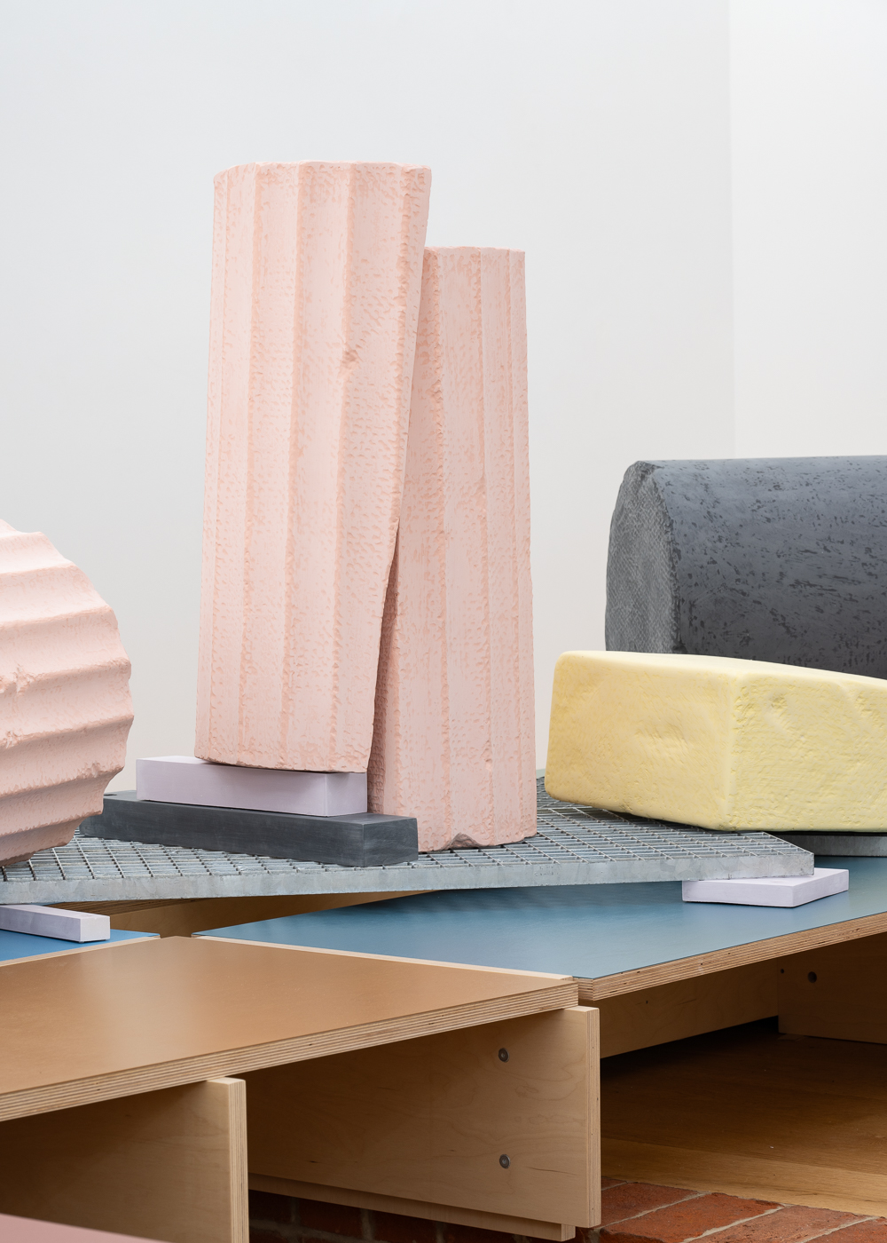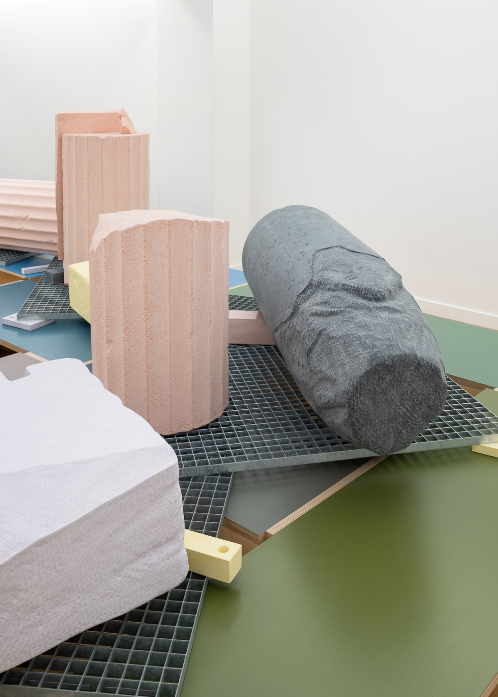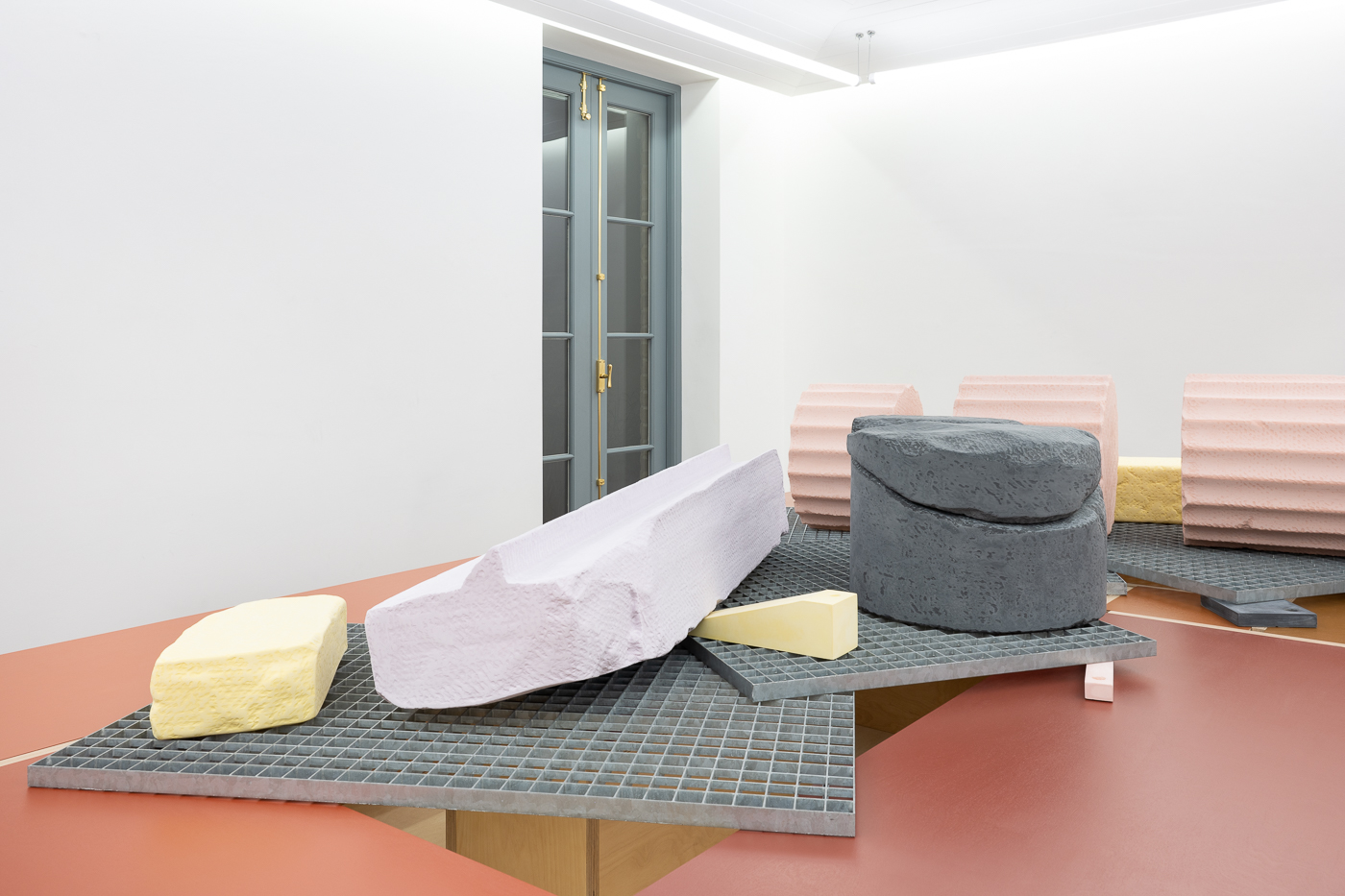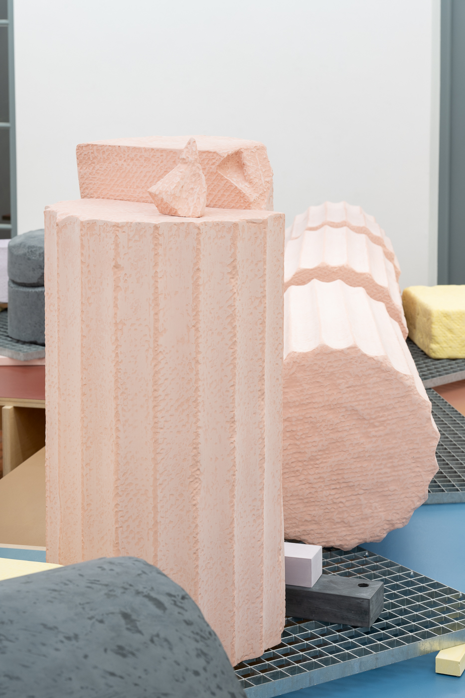 Polystyrene, fibreglass matting, pigmented Jesmonite, galvanised steel elefant grates, wax candles.