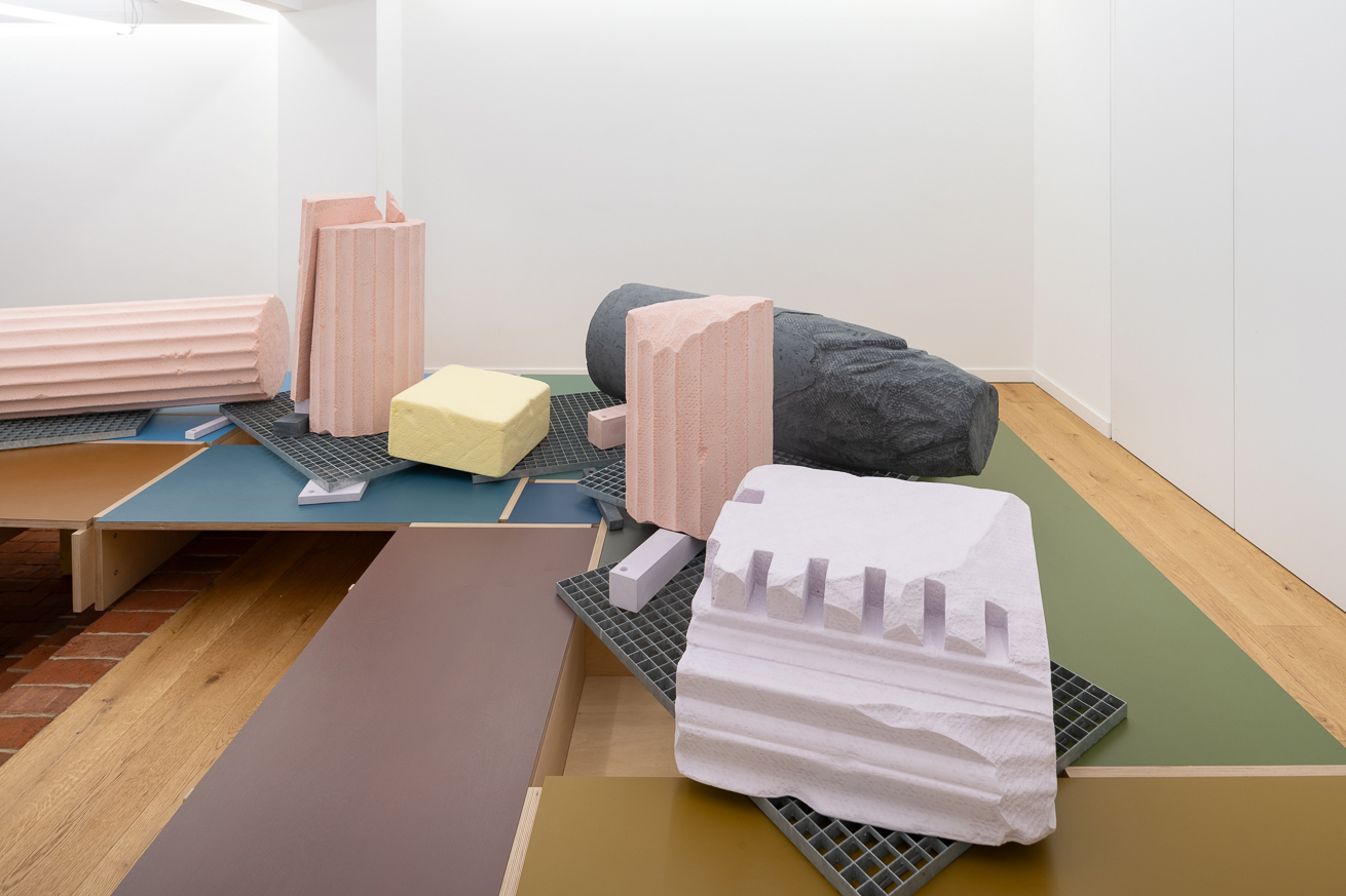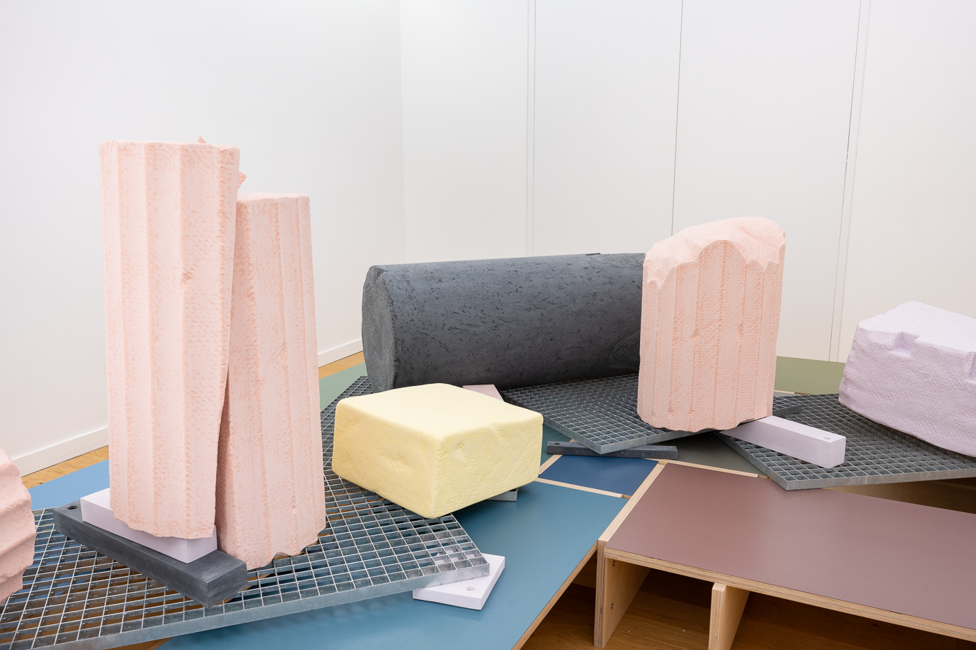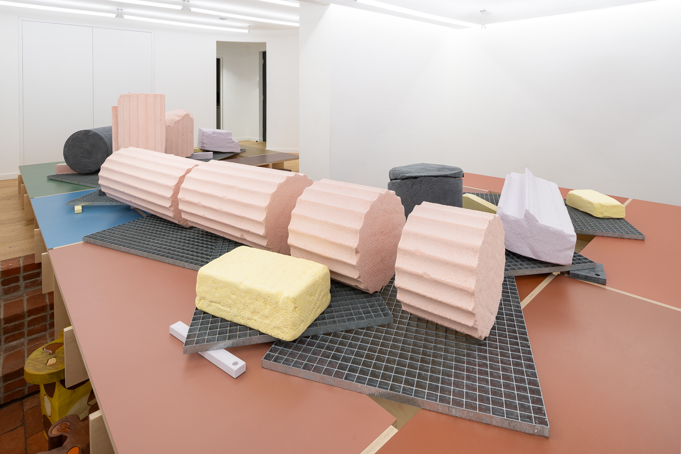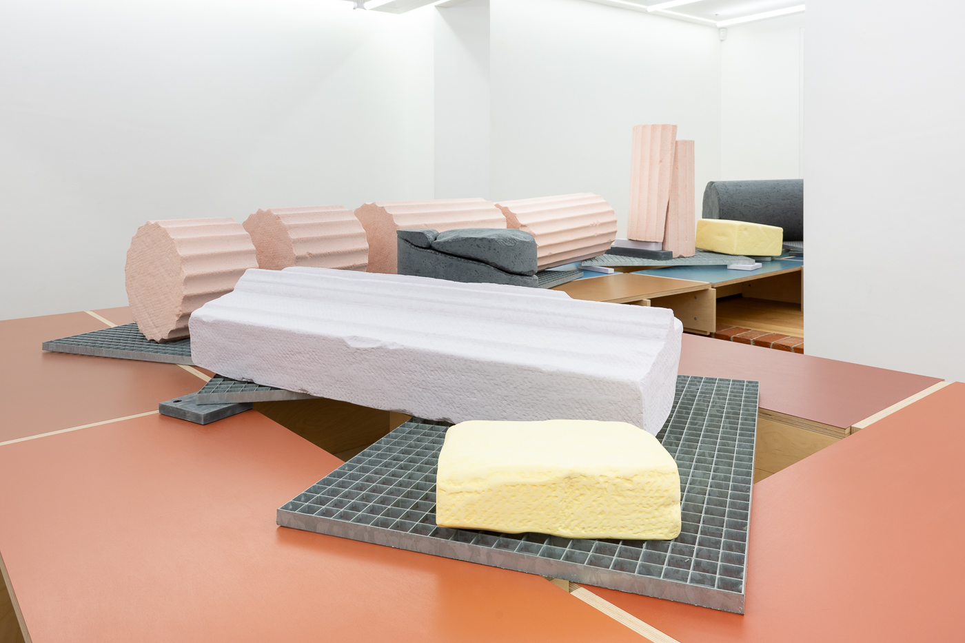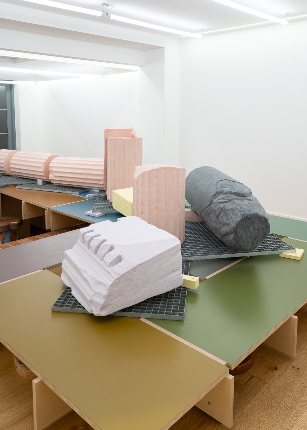 Polystyrene, fibreglass matting, pigmented Jesmonite, galvanised steel elefant grates, wax candles.
